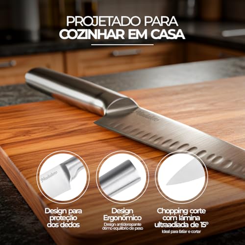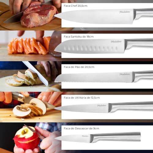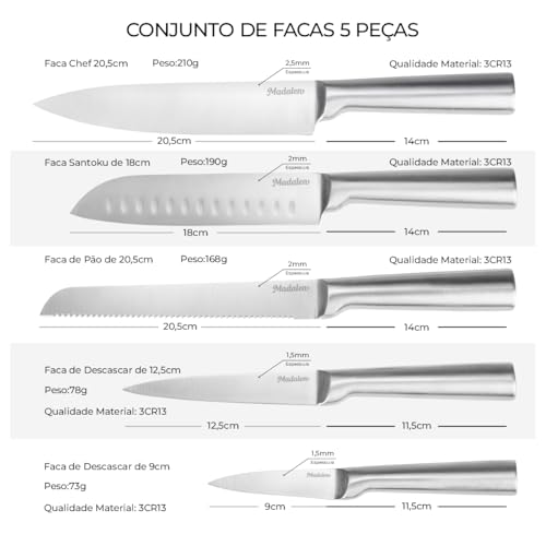 - Kit Completo de 5 Facas: Inclui Faca do Chef (20cm), Faca Santoku (17,5cm), Faca de Pão (20cm), Faca Utilitária (12,5cm) e Faca para Descascar (9cm).