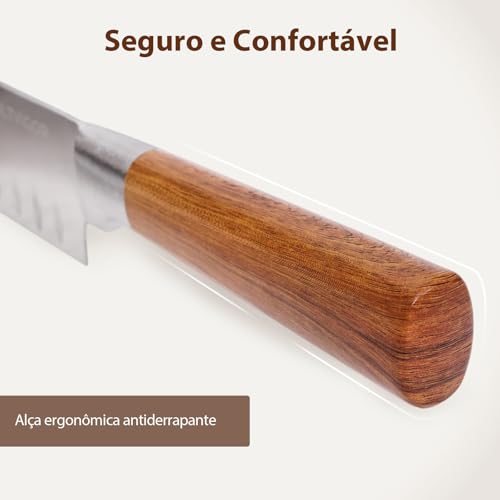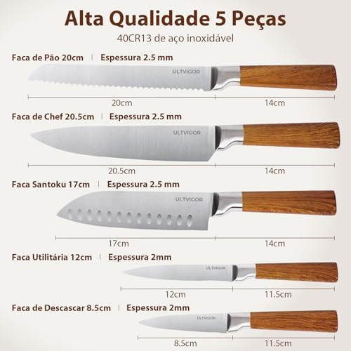 • Conjunto Completo: Inclui 5 facas essenciais: Faca de Chef, Faca Santoku, Faca de Pão, Faca Utilitária e Faca de Descascar.