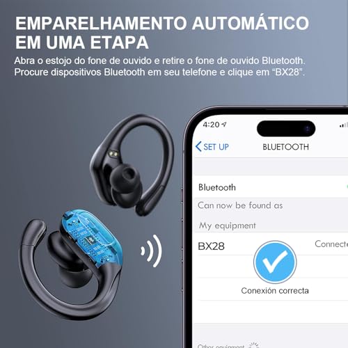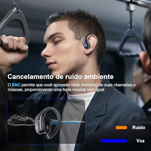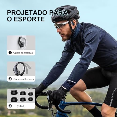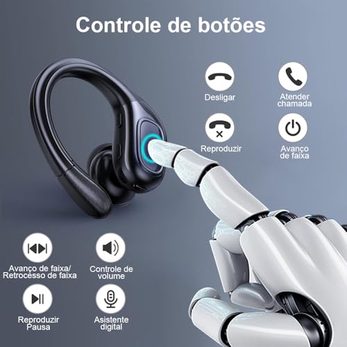 • Fone de ouvido Bluetooth 5.3 com gancho esportivo e resistência à água IPX7.