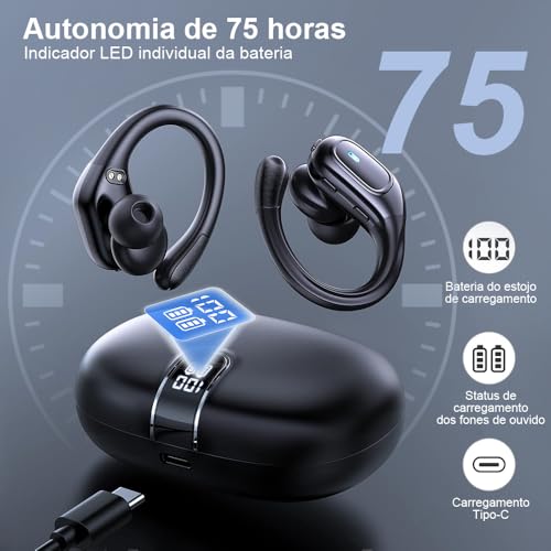 Fone de Ouvido Bluetooth 5.3 Esportivo IPX7 com 75H Bateria