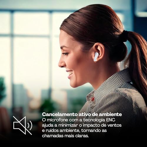• Cancelamento Ativo de Ambiente (ENC): Com tecnologia de microfone avançada, suas chamadas ficam claras, mesmo em ambientes barulhentos.