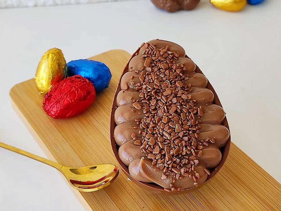 Por fim, é hora de desenformar e rechear o ovo de Páscoa. Para desenformar, basta virar a forma sobre uma superfície forrada com papel-manteiga e dar leves batidinhas. Em seguida, é só rechear com o que preferir, como brigadeiro, doce de leite, ganache, entre outros. Para finalizar, basta fechar o ovo com a outra metade de chocolate e levar à geladeira por mais alguns minutos para que o recheio fique firme.