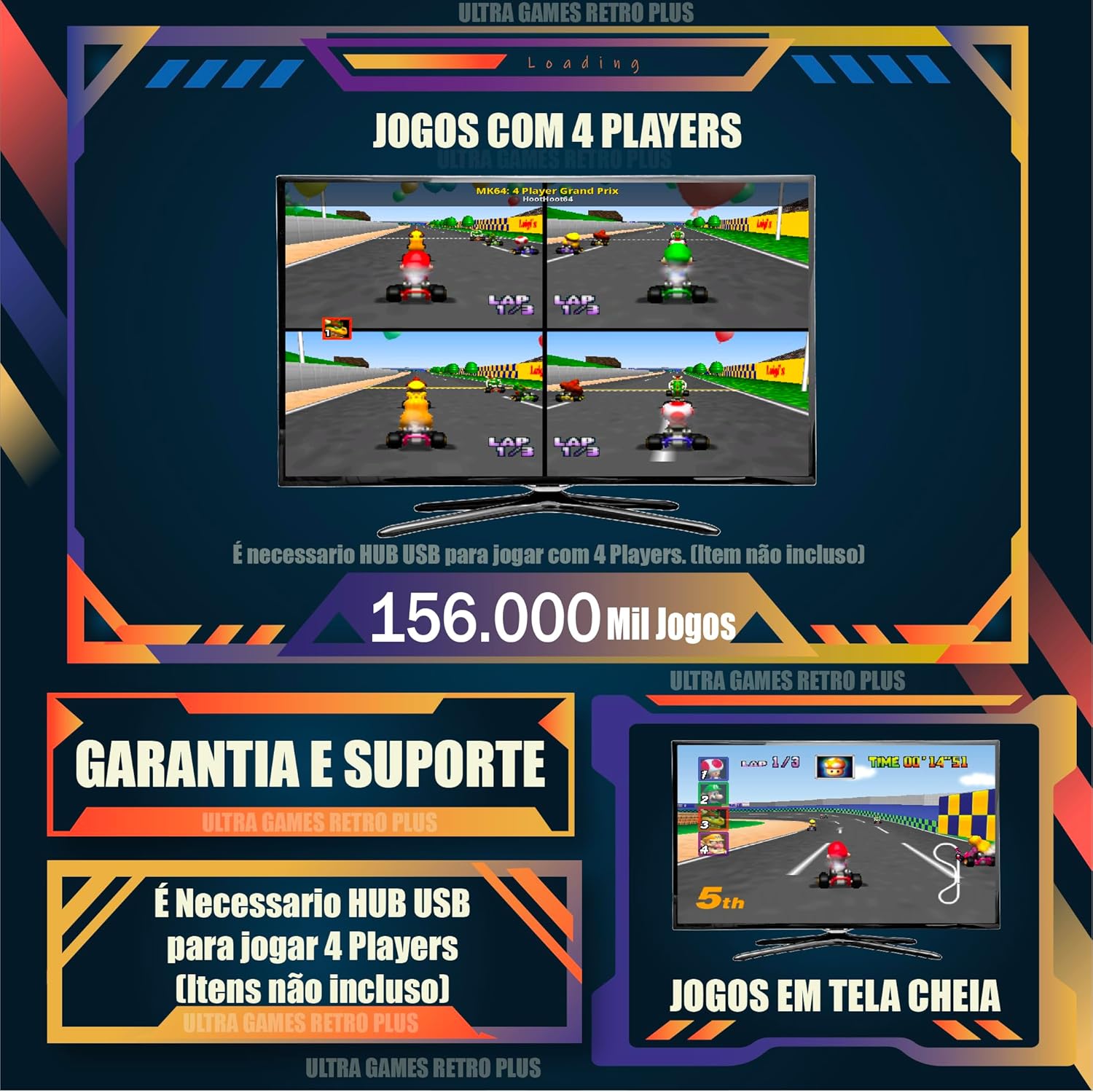 Reviva a era dourada dos videogames com o Console Super Retro Premium, uma incrível máquina do tempo digital que oferece acesso a mais de 156.000 jogos clássicos. Este sistema atualizado para 2026 inclui uma biblioteca massiva de títulos das plataformas mais icônicas: PS1, N64, SNES, MAME, Atari, Sega, GBA e NeoGeo. O pacote vem completo com 4 controles de alta qualidade, permitindo diversão multiplayer instantânea. O console apresenta uma interface Android moderna com Modo Smart Plus e suporte a APPs, combinando nostalgia com conveniência contemporânea. O design elegante apresenta arte personalizada com personagens clássicos dos videogames, e o sistema inclui um controle remoto para navegação fácil no modo smartplus. A instalação é simples e intuitiva, permitindo que você comece a jogar em minutos apenas conectando o cabo hdmi na TV. Ideal para colecionadores, entusiastas de jogos retro e famílias que desejam explorar a rica história dos videogames em um único dispositivo compacto. (OBS: Para jogar com 4 jogadores é necessario o HUB USB que aumenta quantidade de entradas usb Item não incluso).